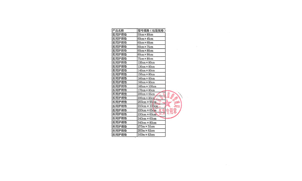 [規格尺寸] 醫用護理墊的基本規格尺寸為50cm×80cm、60cm×45cm、60cm×60cm、60cm×75cm、60cm×80cm、60cm×90cm、75cm×80cm、120cm×80cm、130cm×80cm、140cm×80cm、150cm×80cm、160cm×60cm、160cm×80cm、160cm×100cm、170cm×80cm、200cm×65cm、200cm×80cm、200cm×90cm、210cm×100cm、220cm×65cm、230cm×60cm、240cm×60cm、240cm×80cm,275m×55cm、200m×62cm、100m×63cm規格允差為±8%。